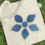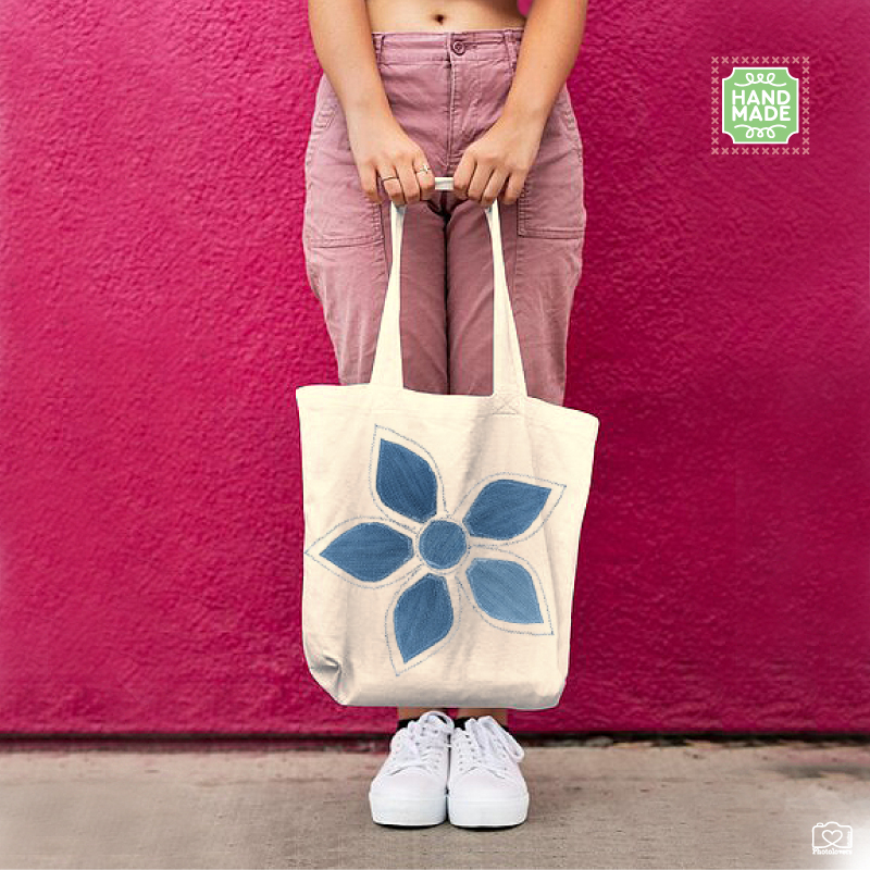Υφασμάτινη (cotton) βοηθητική τσάντα. Cotton. Λουλούδια από τζιν ύφασμα. Διαστάσεις: Υ41χ35.